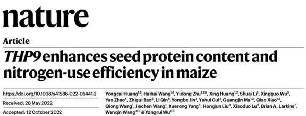 北京時間2022年11月17日,中國科學院分子植物科學****中心巫永睿研究團隊與上海師范大學王文琴研究團隊合作在Nature上發(fā)表了題為 “THP9 enhances seed protein content and nitrogen-use efficiency in maize”的研究論文。