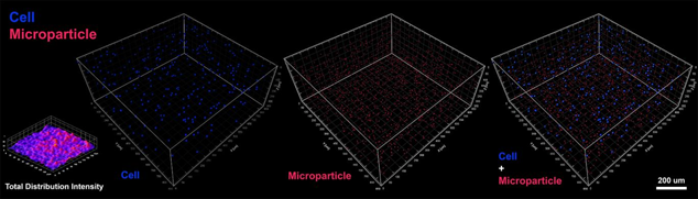 共聚焦圖像的3D建模顯示水凝膠結(jié)構(gòu)內(nèi)細(xì)胞(藍(lán)色)和TMP(紅色)的均勻3D分布,表明水凝膠結(jié)構(gòu)中細(xì)胞和磁性顆粒的均勻分布。