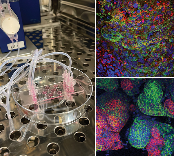 從左起:ibidi μ-Slide III 3D Perfusion用于hiPSC衍生的心臟微組織和腎臟類器官的共培養(yǎng)。在芯片上共培養(yǎng)72小時后保留的心臟和腎臟結(jié)構(gòu)(分別)的免疫熒光圖像。心臟肌節(jié)的標(biāo)記物:α-輔肌動蛋白-2(紅色)、肌鈣蛋白I(綠色)。腎臟腎單位結(jié)構(gòu)的標(biāo)記物:腎素(紅色)、lotus tetragonolobus lectin蓮藕凝集素(近端小管,綠色)。