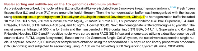 Tissuelyser-24L發(fā)揮了不可或缺的作用。研究團隊利用這種凈信的組織研磨儀,從雄性獼猴的肝臟和大腦中提取細胞核,為后續(xù)的單細胞RNA測序(snRNA-seq)分析奠定了基礎。通過精確的細胞核分離和高質量的樣本制備,研究人員能夠深入探究二甲雙胍對細胞老化的具體影響,從而揭示了其在延緩衰老中的分子機制。