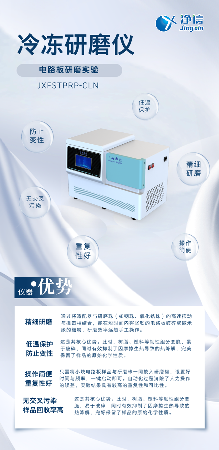 凈信冷凍研磨儀憑借其低溫、避免污染的研磨特性,成功解決了電路板這類(lèi)復(fù)雜復(fù)合材料的前處理難題。它不僅是提升RoHS檢測(cè)、材料成分分析等數(shù)據(jù)準(zhǔn)確性的“得力助手”,也是在電子廢棄物資源回收領(lǐng)域進(jìn)行物料分析的“神兵利器”。選擇凈信冷凍研磨儀,意味著選擇了一條通往更可靠實(shí)驗(yàn)結(jié)果的捷徑,為您的科研與質(zhì)控工作提供了強(qiáng)有力的技術(shù)保障。