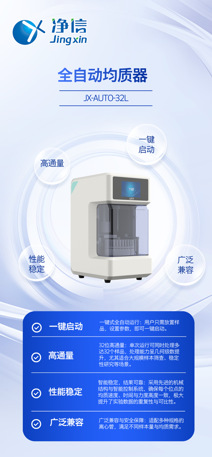 凈信JXAUTO-32L全自動均質(zhì)器,不僅僅是一臺提升效率的設備,更是實驗室邁向標準化、自動化、智能化的重要一步。它通過取代重復性人工勞動、保證數(shù)據(jù)源頭的一致性、大幅提升科研產(chǎn)出速度,為研究人員贏得了寶貴的創(chuàng)新時間。在追求效率的時代,JXAUTO-32L正成為眾多質(zhì)量控制、研發(fā)創(chuàng)新實驗室中不可或缺的得力助手。